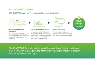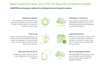 Discover CLARIPROD's platform! With our portal, visualize real-time data of your injection molding machines and production through a live dashboard, performance reports, and instant alerts on any device with unlimited users. Plant managers will get actionable insights from machinery and operations, while executives analyze reports of critical KPIs at any time to take data-based decisions. Transform data insights into actions to reduce machine downtimes, increase throughput and reduce rejects.