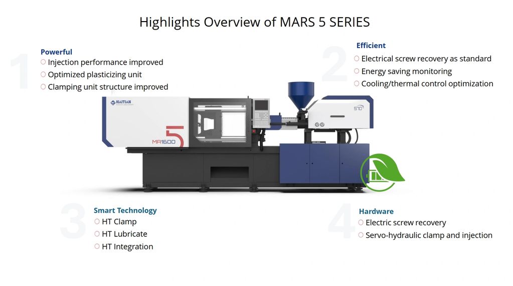 Relying on the fifth generation technology and inheriting the excellent genes of the world’s best-selling servo hydraulic energy-saving injection molding technology, MA5 was launched. The full range of performance breakthroughs and advancements, from injection to plastification and mold clamping structures, are optimized and improved in every aspect. The hardware configuration continues to evolve and bring new appearance upgrades, setting industry benchmarks for performance and quality, and easily coping with future.