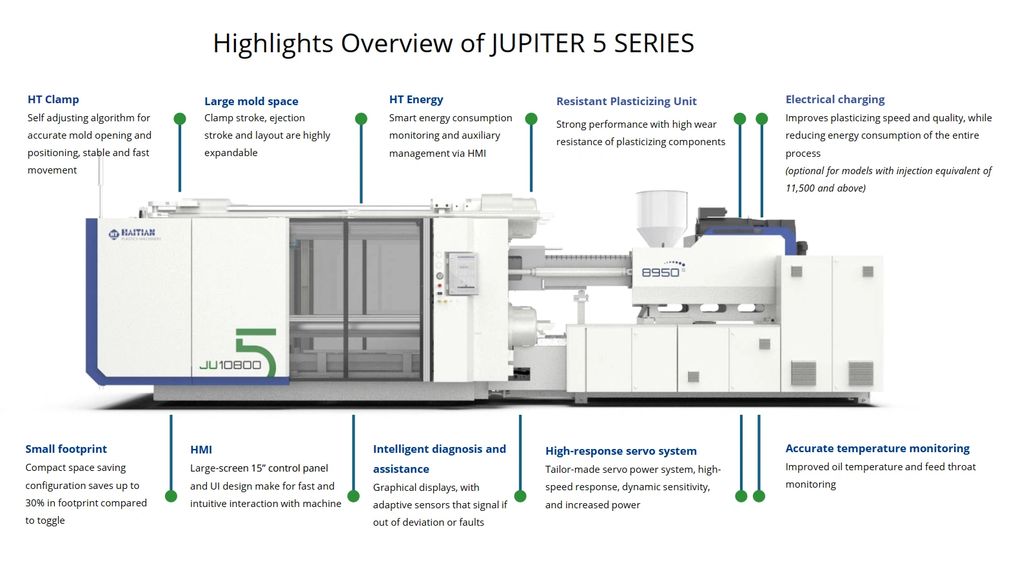 The machines are equipped with Haitian’s latest servo-hydraulic technology and a newly developed electric charging system (standard on small and medium injection units), significantly reducing energy consumption while maintaining high output and repeatability. Smart production features, including real-time data tracking and Industry 4.0 compatibility, make the new Jupiter ideal for large-par