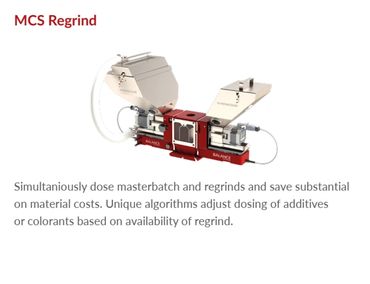 Dosing rejects and sprues in the form of regrind can result in saving substantial amounts of colorant. The secret? Dosing masterbatch, powder, liquid or another additive and regrind simultaneously. One dosing unit of the MCS Regrind functions as the main unit and doses regrind, while the second operates in conjunction with the main unit and doses the additive. In practice this means that the more regrind is available, the less colorant is added. This enables you to avoid overconsumption of additives and reuse the maximum regrind. The process is fully automatic, so you always dose the maximum percentage of available regrind. The quality remains constant, production run after production run, 24/7.