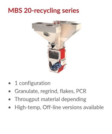 The MCHigh Output 2500R is a complete system for feeding low density regrind at high dosing rates. The unique design with a mixing rate of maximum 75% can be mounted directly on top of the injection molding machine or extruder. The gravimetric technology controls the dosing rate and provides exact material consumption data for track and trace purposes. The unit has an integrated weighing module that precisely measures the throughput by the loss-in-weight principle. Refilling of the hopper can be done either by direct mounting of the hopperloader on top of the system or by the integrated knife valve at the top flange. The refilling is controlled by the gravimetric system. The MCHigh Output 2500R handles granulates and difficult regrinds like PET bottle flakes. It is capable of processing materials up to 180 °C. The water-cooled neckpiece with integrated mixer ensures the right mixture of materials for your product and the possibility to add additional dosing stations for masterbatch or other additives.