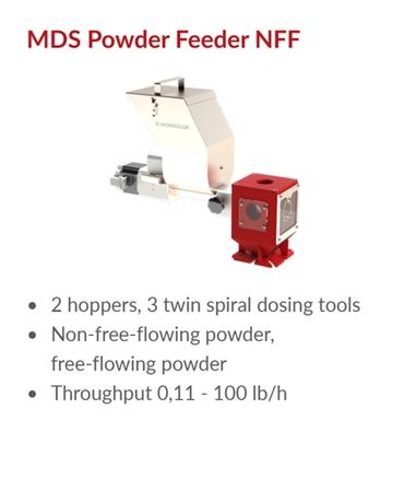 Dosing powder is one of the most difficult challenges in the field of dosing, especially when we talk about non-free-flowing powders at extreme low rates. Expensive powder additives that add high impact to your process require the best in the field of accuracy and reliability. Movacolor has, based on its proven gravimetric technology, developed a compact powder dosing unit to do just that. It doses as low as 100 g/h, but also as high as 40 kg/h. Double spiral and hopper agitation ensure trouble free dosing of the most difficult powders. And this is accomplished in both injection molding and extrusion applications. The unit operates as a single unit, but can also be integrated into our unique modular continuous blending system, allowing to add the most difficult powders to the blend of your extruder. The MCPowder is a truly unique product in the market that makes you forget any powder dosing problem you currently might have.