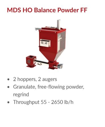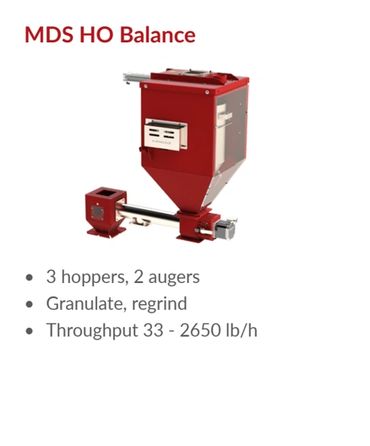 Configurable with up to six MDS Balances and specialized inserts, the MHBS Hybrid Blender is able to precisely dispense your most valuable additives with temperatures up to 70 degrees and a throughput up to 1600 kg/h. The MHBS blender achieves the highest possible accuracy by inline feeding critical additives directly into the pre-mixed material batch. The gravimetric dosing units equipped with our unique Balance technology deliver a remarkable 3x improvement in shot-to-shot accuracy compared to our MBS Blender.
